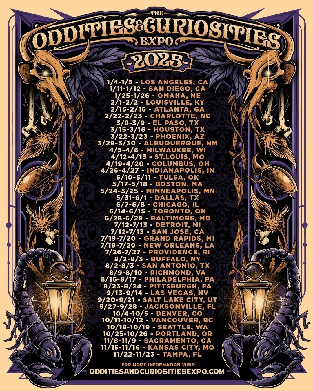 Next FIVE in-person events New Jersey Punk Rock Flea MarketTHE ULTIMATE UNDERGROUND SHOPPING EXPERIENCE & ARTS FESTIVAL Saturday, July 26, 2025 10 am - 5 pm The NJ Expo Center in Edison, NJ Punks 12 and under are free! CLICK ON THE IMAGES FOR A DIRECT LINK TO THE WEBSITES FOR MORE INFORMATION Philadelphia Oddities & Curiosities Expo 2025Starts: Saturday, August 16th, 2025Ends: Sunday, August 17th, 2025Starts: 10:00 AM EDT Ends: 4:00 PM EDTGreater Philadelphia Expo Center100 Station Ave, Oaks, PA Market of the Macabre Saturday, September 2012:00 – 5:00 PMAt Laurel Hill East Cemetery3822 Ridge AvenuePhiladelphia, PAJ Darkside New Jersey Art & Oddities MarketOctober 18, 2025 10 am - 8 pmNJ Expo Center Edison, NJ FIRST VENDING APPEARANCE !MONSTER-MANIA 65 NOV 21-23, 2025 The Greater Philadelphia Expo CenterOaks, PA